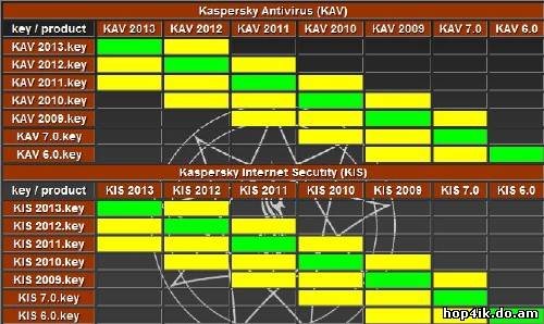 Сборник ключей для популярных антивирусных программ: ESET NOD32, Kaspersky, Avast, Avira! [spoiler=Таблица совместимости ключей (Kaspersky):] [/spoiler]
