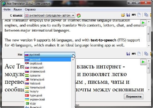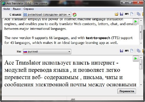 ![]() Ace Translator – это отличный и мощный интернет-переводчик, работающий на мощном движке, который позволяет быстро и качественно переводить как любой сложности тексты, так и электронные письма, чаты и т.д. Программа имеет многоязычный интерфейс (включая русский) и поддерживает перевод около 66 языков мира! Данная особенность программы объясняется довольно мощной базой данных, в которой содержится обширный массив словарей и приложений. Несмотря на большое количество поддерживаемых иностранных языков, переводчик Ace Translator не оказывает существенной нагрузки на компьютер и занимает незначительное место на жестком диске. Ace Translator имеет весьма удобный для пользователя многоязычный интерфейс, разработка которого осуществлялась исходя из пожеланий поклонников данной программы. Переводчик Ace Translator в своей работе использует современный метод работы со словарями, что позволяет сократить нагрузку на оперативную память компьютера. Также стоит отметить, что поддерживается функция авто определения языка перевода. Операционная система: Windows XP/Vista/7/8/8.1 Название программы: Ace Translator Версия программы: 12.6.2 Последняя Версия программы: 12.6.2 Язык интерфейса: MULTi / Русский Лечение: в комплекте Тип лекарства: Готовый серийник Тип файла: .rar Размер: 6,06 Мб Скачать Ace Translator 12.6.2 (2014) Portable